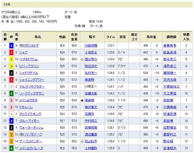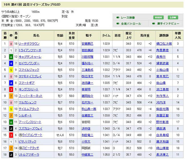 1〜5着が△▲○◎△。なのに△▲○の三連複(86倍!)を買ってないとは(;´д`) しかも軸の◎セイウンワンダーが4着ってのが悔し過ぎます。 1・2番人気の2頭(スマイルジャックとスーパーホーネット)を抑え程度に軽視するのは正解だったものの、リーチザクラウンがこの路線で素質開花するとはねぇ(つーかこれまで武豊が下手だったのか?w)。やはり気性が難しいので長距離は向かず、且つダートは走らないという事ですか。ならば今年の安田記念は素直にコイツで良いのかな?本番までにもう1回くらい使って欲しいですとこですけど(京王杯SCあたり)。 トライアンフマーチ、キャプテントゥーレは期待通りの走りを見せてくれて満足です。前走大敗の2頭ですが、やはり距離と展開さえ向けば強いですよこいつら。セイウンワンダーは道中ちょっと後方過ぎただろ・・・。休み明けで6kg増えて524kgもあったんだから、ここはもうちょっと前で強気の騎乗をして欲しかったですな。