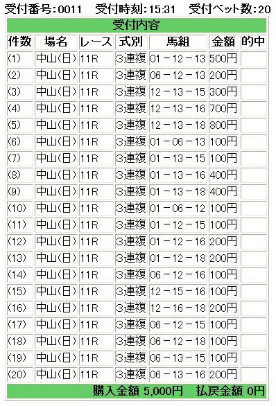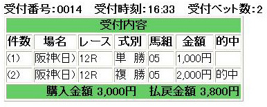 あぁ、絞らずにもうちょっと買い目増やしておけば確実に2-12-18の三連複は買えたよなぁ・・・。つーか三連複またはワイドの軸馬が4着ってパターン多過ぎだよ俺(;´д`)