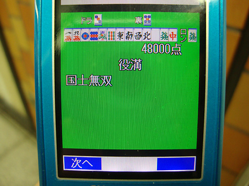 そうそう、映画館への道すがらにケータイのアプリで麻雀やってたら、遂にあのテを和了ってしまいました!!!!!