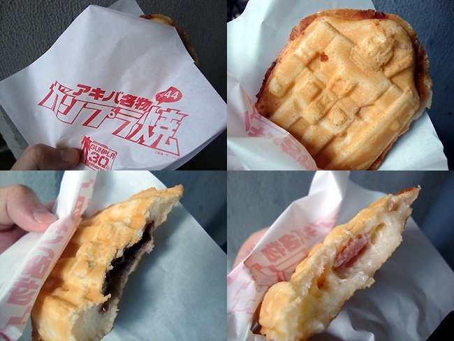 で、そのショップでは焼きたての「ガンプラ焼き」なる物も販売しています。メニューは北海道小倉あんが190円、ベーコンマヨネーズが220円・・・なのですが、オープン販売で今は2つのセット・400円のみとなっています。