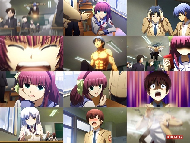 椅子ごと天井に打ち上げられた日向。さすがにこれにはNPCも全員注目。その隙に竹山はテストのすり替えに成功します。 これは日向の陽動が滑った時のためにゆりが椅子に仕掛けていた物。つーか日向はこのためのギャグ要員だったのかw 選抜理由に納得。 次のテストの陽動要員は高松。これまであまり目立った活躍の無かった高松ですが、「参謀っぽい風体ながら、頭は阿呆」というキャラがここで炸裂!実は脱いだら凄かったんですwww しかしそんな筋肉美なんぞにNPCは関心が無く、またもゆりの打ち上げ対象にw なんだこの酷いギャグ展開はwww 続いての刺客は大山・・・この無個性の塊のような男に、ゆりは「天使に愛の告白をして気を引け」とこれまた酷い指示を出します。うーん、ここまで来るとちょっと虐めっぽくて鼻に付き始めますねぇ。 大山の愛の告白に振り返る事も無く冷静に対応する天使・・・あぁ、またコイツも打ち上げか・・・と思ったら、打ち上がったのは日向www