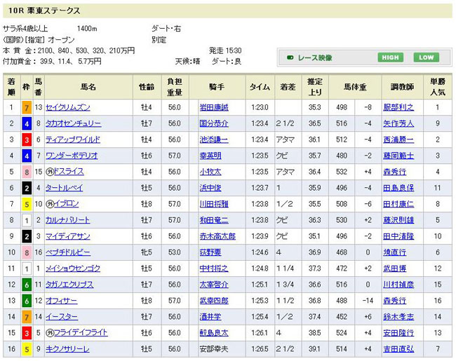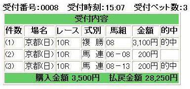 ・・・と、ハズれた馬券をいつまでも悔やんでいても仕方がない。 実はこの日の勝負レースは他にありました。昨晩、とある情報ルートから人気薄の馬の激走情報が入りました。京都10R、栗東ステークス(オープン特別ダート1400m)。前走大敗で大きく人気を落としているタカオセンチュリーが今回化けるとの話・・・。 確かに前走トパーズステークスでは16着と惨敗してますが、実はこれは熊沢騎手が騎乗ミスを犯してのもの。馬のポテンシャルはトパーズSまで6戦連続連対を続けていた時と全く変わっておらず、今回は好走間違いなし、と。 人気は当日9番人気で単勝32・6倍、複勝5・9倍。騎手も今回は若い国分恭介に乗り替わりという事もあって全く人気になってません。ワタシも首を傾げながらもこの馬の複勝と、1・2番人気馬への馬連をちょっとだけ押さえてみました。結果・・・