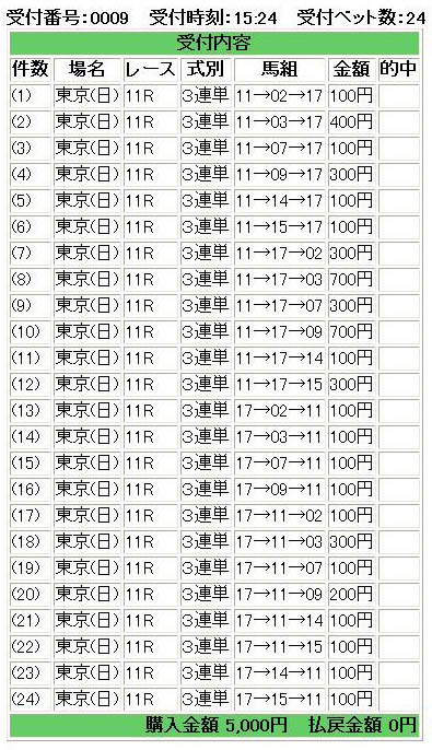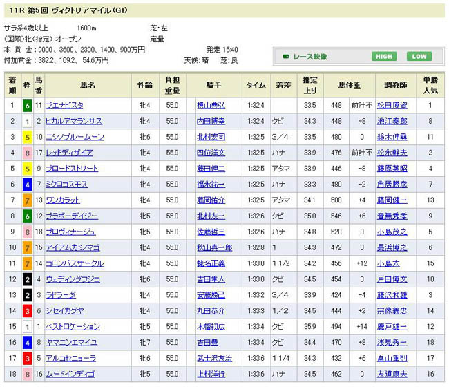まぁここは深く考えずにこの2頭を信じましょう。◎ブエナビスタ、○レッドディザイア。▲は該当馬ナシ、以下△でヒカルアマランサス、ラドラーダ、ミクロコスモス、ブロードストリート、コロンバスサークル、アイアムカミノマゴ。買い方は◎○の1〜3着固定で△に流す三連単変則フォーメーション24点。15番人気のコロンバスサークル(実は府中マイル適性がかなり高い)辺りが絡んでくれれば、◎○が頭でもしっかり万馬券になってくれます。 結果・・・