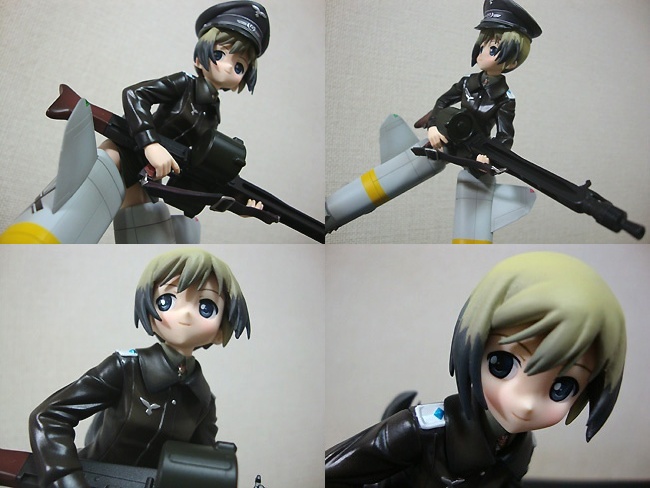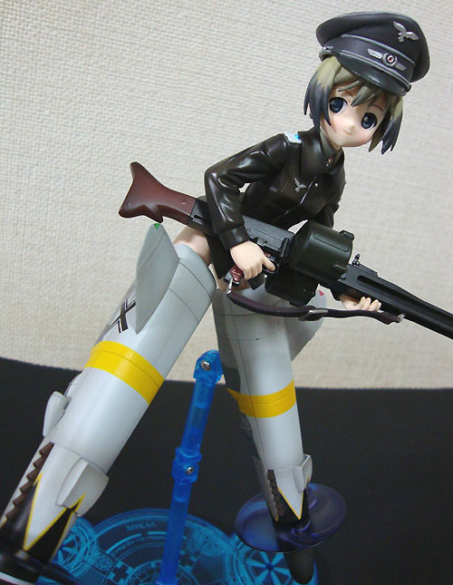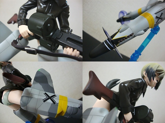 メカニックいろいろ。まずは構えるMG42。正直、思ったほどのディティールではなかったかな(^_^; ・・・と言うのも、実はGIジョー軍装シリーズのMG42を持っていたりするので、作りの精巧さはどうしてもそちらに軍配が上がってしまうんで。それにしても16歳の女の子が担ぐ武装としては、あまりにも重いシロモノだと思うんですけどねーw そこはフィクションの世界ってことで。 そしてストライカーズユニット・Bf109-G6。こちらは塗りも丁寧で、スジ彫りもしっかりしていて良い感じ♪ プロペラは回転状態と停止状態が選べますが、やはりここは回転状態で飾りたいですな。