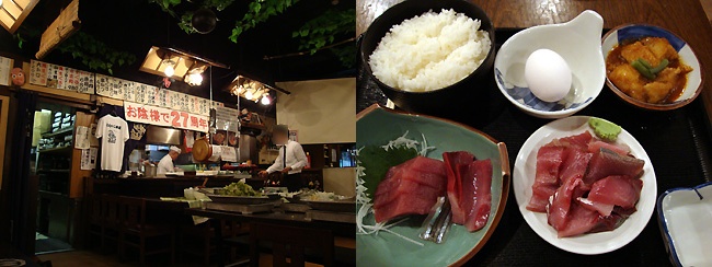 先にお代を払っていざ突入。地下にある店内はやや古びていますが、中央奥のカウンターでは板前さんがバサバサと魚をさばいて行き、大量の刺身が氷の上に並べられて行きます。それを好きなだけ皿に取っていざ実食! うん、食べ放題の店にしてはそんなに味は悪くないです。欲を言えばもうちょっと刺身のバリエーションが欲しいなぁ、とも思いますけど(この日は2種類だけ)。