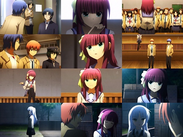 ところが翌日、高松は普通に登校して教室におり・・・しかしその高松は眼鏡をかけておらず、制服も一般生徒と同じ物。そしてSSSでの記憶を完全に失っていました。ゆりっぺは高松がNPCになってしまったと判断。成仏する事も出来ず、このまま永遠にここで彷徨う魂となってしまった・・・まぁ高松だからいいか(酷 SSSのメンバー全員を体育館に集めたゆりっぺは非常事態の宣言を行いますが、同時に「自分と違った考えを基に行動する者」の存在を公表します・・・って、ゆりっぺにもバレてたー!!! 正直これは予想外の展開です。ゆりっぺは音無の考え・行動を否定せず、それを本人の口からメンバー全員に伝えさせ、音無の考えに同調する者はそうしても良い、と告げます。凄い器の持ち主だなゆりっぺ・・・。SOS団の団長だったら「私の意見に従わない奴は死刑よ!!」と言う所だろうにw 集会の後に音無らを呼び出すゆりっぺ。そして奏の扱いについて話し出し・・・って、奏は天使でも何でもない、普通の人間だって!?第1話でもそう言ってたって!?何だよこのオチは(;´∀`)