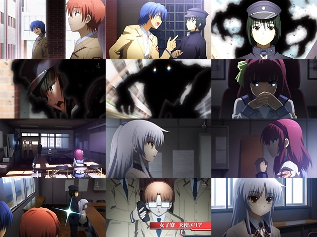 次は誰を成仏させよっかなー、と言うかなりブラックな発言を事も無げに言う音無さんマジパネぇっス!って、日向だけでなく直井にまでバレてる!?つーか気付けば見事なトライアングラーだよコイツらw 日向はやっぱ音無>ユイだった訳だな(;´∀`) そんなアッー!な展開の中、直井うしろ、うしろー!! これが先週野田が戦っていた謎の「影」ですか。直井を取り込もうとする影ですが、音無の体を張った救出劇と日向の銃撃(銃は常に携帯しているのか・・・)もあって何とか「影」の撃退に成功します。その様子をゆりっぺに報告する遊佐・・・「影」の白い目とゆりっぺの目のハイライトが被って見えるのはワタシだけでしょうか。 「影」の存在に関して聞き出すべく、奏を生徒会室に呼び出すゆりっぺ。しかし奏も「影」に関しては全く関与しておらず・・・。発言の裏を取るべく、クラ(ry竹山を奏の部屋に派遣しているゆりっぺ何て恐ろしい娘。つーかこう何度も部屋への潜入を許す奏の無防備っぷりは生徒会長としてどうだろう。 そんな時、校庭から銃声が・・・。SSSのメンバーが「影」の集団に包囲されている非常事態。奏は新たに装備した「翼」を使って現場に急行します。
