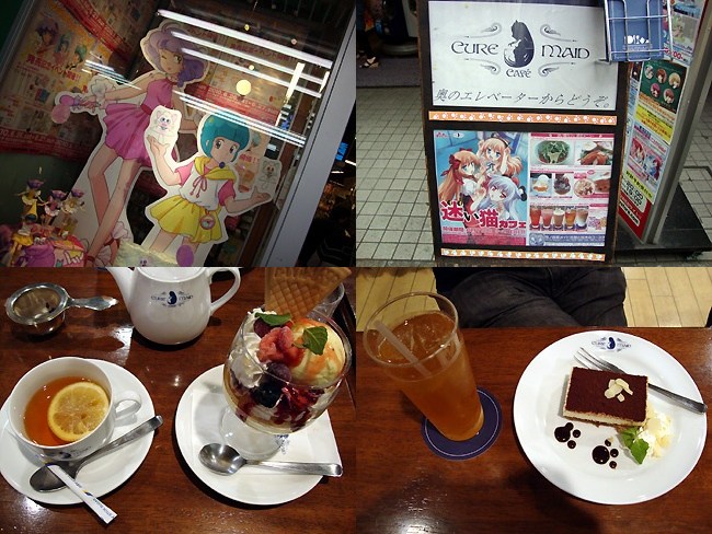 その後はアニメイトを回り、とらのあなで同人誌を漁った後に『CURE MAID CAFE』へ。キュアでは20日まで『迷い猫オーバーラン!』とのコラボ企画、迷い猫カフェを開催中。オリジナルメニューを注文すると、梅ノ森家メイドの佐藤さん&鈴木さんのコースターが入手出来ます。 ワタシは「巧のもてもてぱふぇ」を注文・・・何気にオーダーするのが恥ずかしい商品名ですが、あの竹達彩奈さん(霧谷希役)が考案したメニューとあらば注文しない訳には行かない!彩奈ちゃんのパフェ、美味しいよ〜、ペロペロ♪(きんもーw 後輩は鳴子叶絵のスパークリングオレンジティー&ストレイキャッツ特製ケーキを注文。作品中と違い、お味は美味だったようです(^_^;
