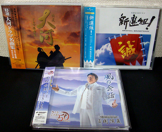 あと、前から欲しいと思っていた歴代大河ドラマの2枚組の主題歌集を購入。今回踏ん切ったのは、ソフトバンクのCMでお父さん犬が選挙に立候補するシリーズのBGMに『風林火山』のOPが使われていた事なんです。やっぱあの曲は名曲ですよ!特にサビ前の武田軍の旗が次々に掲げられるところ(動画の1:54あたり)は鳥肌が立ちます!