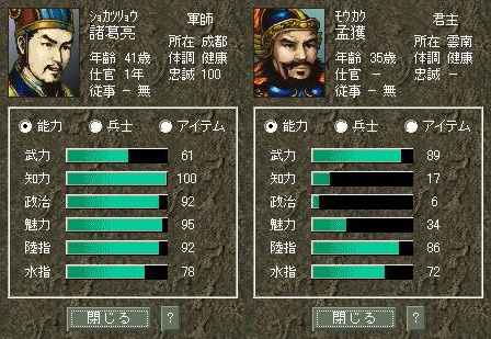 孟獲の能力は・・・勇猛で鳴らした蛮王なので武力はこんな感じ。陸戦指揮能力はちょっと高過ぎ?70台後半くらいじゃないかな。水軍指揮経験は無いと思うので、これは将軍としての能力を持たせるための帳尻合わせですな(三國志Vでは武力70以上かつ陸戦・水戦指揮能力の平均値が70を超えると武官から将軍になれるので)。知力・政治は・・・まぁこんなもん?w 蛮王としてそれなりのカリスマはあったので、魅力はもうちょっとあっても良いと思うんですけどね。