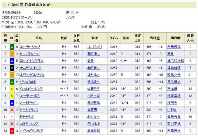 レースは中段を進んだルーラーシップが抜け出して快勝。今年はこの馬がブレイクする予感がヒシヒシです。道中、ルーラーシップを見て進んでいたヒルノダムールが2着・・・やはり勝ち運が無いなぁこの馬。つーか鳴尾記念の1・2着馬がそのまんま今回も来たって訳ですね。