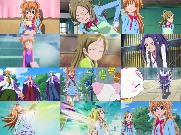 二人は幼馴染みですが、性格の不一致から喧嘩ばかりというのが現状のようで・・・響がスウィーツ部のケーキを盗み食いして奏に怒られる、そんな毎日みたいです。 昔よく一緒に来た音楽堂に一人で来た響。そこに現れた謎の少女・エレン(CV:豊口めぐみ)。彼女は響の中に探している音符「ト音記号」を見付けると突然猫に姿を変え、更に現れたマイナーランドの幹部三人と共に響を包囲し・・・そこに現れたキュウべぇことハミィは、響、そしてレコードを持って現れた奏こそプリキュアと見抜いて二人に変身を促します・・・あんまり妖精さんの言うがままに変身なんてしない方がいいデスヨ?w