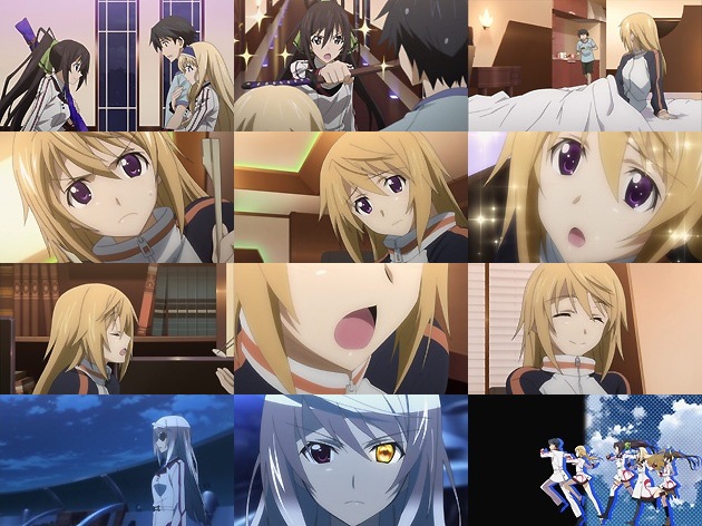 両手に花(ドクダミとペンペン草でも!)から解放された一夏は、シャルのために部屋に食事を持って来てくれます。つーかこのシーンのシャル(キャプ詰め右上)はベッドで待つ愛人みたいだw ごはんに焼き魚に漬物といった思いっきり和食に軽く引くシャル・・・日本食が苦手なのかと思ったら、箸が上手く使えないんですね。割り箸も上手く割れませんしw 密かに苦労人だったシャルに「もっと他人に甘えていい!」と言う一夏。すると箸が苦手なシャルは一夏に 「食べさせて・・・」 と上目遣いに懇願!!!!!ブヒーッ!!!本日3回目の萌え転がりwwwwwシャル可愛い過ぎだろこれwww 俺がこんな娘と同居していたら10分で間違い犯すわ!!!いや8分、いや6分でルパンダイヴだわ! 一夏許すまじ!という視聴者の代弁はラウラが最後に語ってくれます。そしてラウラの眼帯の下にはやはり魔眼が・・・最近だとストパンのもっさん、ちょっと前だとVVVのルチアを思い出しますな。 そしてED・・・やはりシャルが一夏争奪マラソンに加わりましたw しかもトップ独走、それも女子制服で! シャルのスラリと伸びた生足(;´Д`)ハァハァ