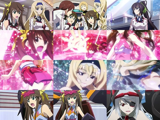 トーナメントで優勝したら一夏とお付き合い出来る、という根も葉も無い噂はすっかり女子たちの間に蔓延。セシリアや鈴までその話を鵜呑みに・・・。一方、噂の出所張本人でもある箒はこの状況に戸惑いを見せるも、自分が優勝するには、かつて剣道の大会で自分が犯した過ちを繰り返さない、つまり感情で戦いに臨んではいけない事を戒めるのでした。 さて、優勝する気マンマンの鈴とセシリアは特訓を開始・・・そういや鈴のIS装着シーンは初披露でしたね。ぺったんこ/ほそい/うすいボディにゴツいISがアンバランスで逆に良い鈴のISです。 そこに突然現れたラウラ。二人のお国柄を馬鹿にした挙句、一夏の事まで悪く言うラウラに中英同盟を締結した二人はラウラに立ち向かいますが・・・