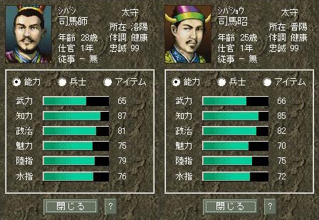 父のクーデターの時の活躍も目覚しく、その死後はありがちな権力抗争も起こさずに兄弟力を合わせて内外の問題に立ち向かっています。しかし司馬師は呉に侵攻した時は諸葛恪に敗れ、蜀に攻め込んだ時は姜維の連弩で大きな犠牲を出し、また司馬昭も姜維の北伐を迎え撃った時に包囲され、郭淮の活躍で何とか脱出したりと、兄弟揃ってあまり戦は得意ではなかったようです。