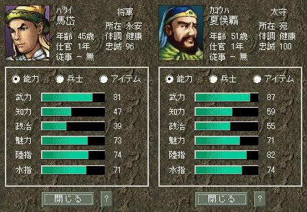 ゲームでは武将として可もなく不可もない能力。魅力値がそこそこあるので、施しなどでも結果を出してくれます(ただし内政は不得手)。武力81は中盤までなら主力して使える数値。ちなみに馬岱の武力はコーエーの三國志(初代)では87あったのですが、Uで83に落とされ、このVでは81に・・・。その後のシリーズでは盛り返しているようですが、まぁ85前後が妥当じゃないかな?と思います。