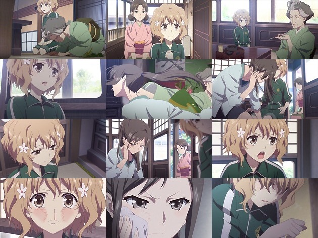 さて、東京から金沢への道中・・・東海ルートかと思ったら新潟回りの日本海ルートですか。いいなぁ・・・この作品にハマったら聖地巡礼はこのコースで行こう(何この予言)。 緒花が乗ってるのはスーパー雷鳥かな?ちなみにこの風景は特定班によって信越本線 鯨波〜青海川間と判明しています。すげーな地元民w そして湯の鷺駅に降り立った緒花が向かう温泉街・・・これも石川県の湯涌温泉と既に特定されているようです。 電車の中で会ったお婆ちゃんのような優しい祖母を想像してやって来た緒花。まずはその旅館「喜翆荘」の静謐な佇まいに感動!そしてその美しさにそぐわない雑草が生えているのが気になった緒花はそれをむしり取り・・・すると、その手を払い除ける黒髪の美少女が。 「死ね」 何とも素敵な出逢いを果たした二人。少女の名は鶴来民子(CV:小見川千明)、旅館に住み込みで働く板前見習いで、雑草と思った草は民子が植えた野蒜でした。そりゃ丹精込めて育てている食材をむしられたら怒るわな。 更に怒る民子を止める和服美少女は押水菜子(CV:豊崎愛生)、そして騒ぎを聴いて2Fから顔を出したのが「喜翆荘」の女将にして緒花の祖母、四十万スイ。スイさんは優しい言葉を掛ける代わりに、バケツと雑巾を緒花に与え・・・こうして緒花の旅館の仲居修行生活が突然始まるのでした。