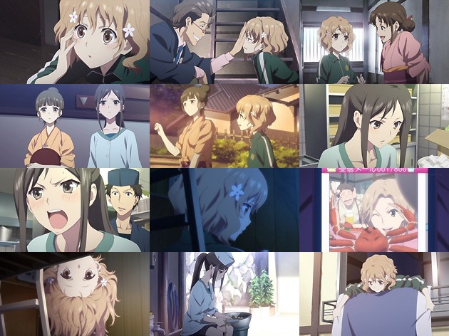 旅館には他に緒花の母親の弟(つまり叔父)の四十万縁、仲居頭の輪島巴(CV:能登麻美子)、板長の富樫に板前の宮岸らの姿が。巴と菜子に案内してもらった緒花ですが、調理場で宮岸に厳しく叱責される民子の姿を見掛け、よせばいいのに首を突っ込んで民子を庇い・・・そして余計なお世話とばかりに更に民子を怒らせてしまいます。 その夜、二段ベッドで初めての孤独を感じる緒花の携帯に母親からのメールが・・・うわ、マジ最低過ぎる。とらドラ!のやっちゃんを想像してたら、ハヤテのごとく!のハヤテの親並みの外道だった。 さて翌朝。昨晩は遅くまで仕込みをしていたのに、今度は朝早くから作業を再開している民子に感心した緒花は、自分に何か出来る事は無いかと考え、湿っぽい民子の布団を代わりに干してあげることに・・・しかし旅館の仕来たりを何も知らない緒花は、従業員の布団を表側に干した挙句、それを落として階下の宿泊客を驚かせてしまう失態を演じます。