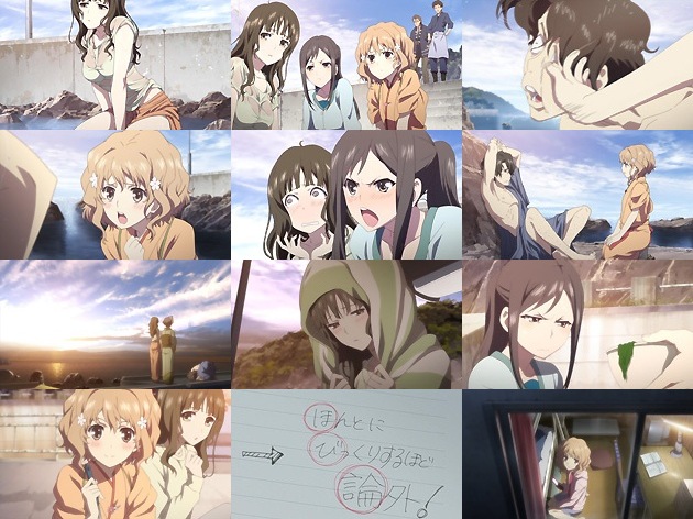 百合風呂妄想だけでもお腹いっぱいだったのに、今度は菜子の透け透けキタコレ♪ 今回は話的にも絵的にも眼福過ぎます。 次郎丸の幻想をぶち殺す右手の一撃を加えたのは緒花でした。次郎丸の小説の中に登場した緒花は「輝きたい!」と言っていた。それは緒花自身が見付けようと思って見付けられなかった自分の生き方の答え。それを見抜いていた次郎丸の人物観察眼は、小説家としての才能だ・・・。緒花の次郎丸を励ます言葉でしたが、自分たちを登場人物にした官能小説を書かれていた事を知った民子はド怒りMAX、菜子に至っては気絶寸前ですw スイに土下座して詫びた次郎丸は、当面の宿泊費を弁済するために喜翆荘で働く事に・・・って、えー!?コイツに旅館の仕事が務まるのかいな? 一件落着した面々は、浜辺で鍋を囲って遅いまかない。ここぞとばかり民子にほうれん草を山のようによそって渡す緒花に、民子は今回のサブタイにもなっている「ホビロン!」という謎の言葉を投げ掛け・・・ その日の夜、緒花は民子のベッドに残されたノートから、民子が「死ね!」に代わる緒花への言葉を真剣に考えていた事を知ります。その結論がキャプ画の通りホビロン・・・これ、流行るかな?でも「ホビロン」で画像検索しちゃダメだぞ!お兄さんとの約束だ!(グロ中尉なので)