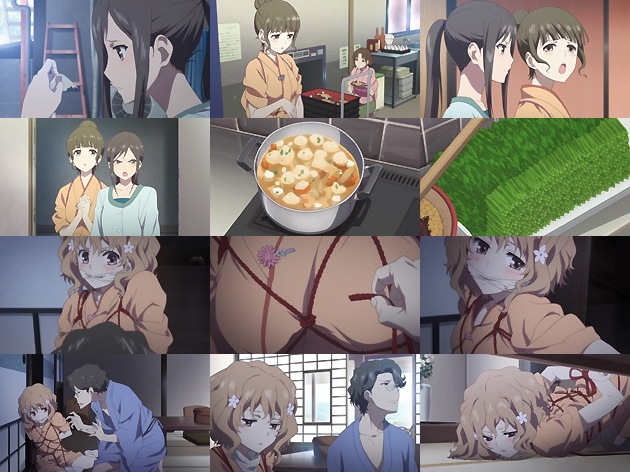 幸い今日は宿泊客がいない事もあり、従業員は総出で失踪した緒花を探す事に。そんな中スイは、菜子に次郎丸の部屋を探すように伝え・・・ さて、場面変わって。宿の風呂場でモップを使って緒花にくんずほぐれつの調教を施す民子と菜子・・・なんぞこれ!?!?と思ったら、なんと次郎丸の官能小説の1シーン。あまりにリアルな心理描写に驚く緒花に「いつも見ていたから分かる」と答える次郎丸・・・思わず身体を隠す緒花がかわええw つーか自分が主人公の官能小説を目の前で読まされるなんて、これはある種のプレイ以外の何物でもないよなw そこに緒花を探しに菜子が現れます。次郎丸のために空気を読んで身を隠す緒花ですが、次郎丸が菜子の事を悪し様に言うのが耐え切れなくなって顔と口を出してしまいます。緒花を監禁している事がバレた次郎丸は、菜子も縛って監禁しようとしますが、その背後には営繕の豆じいもいて・・・縛られそうになった豆じいの反応が予想外過ぎて、飲んでたドクペ吹いたwww
