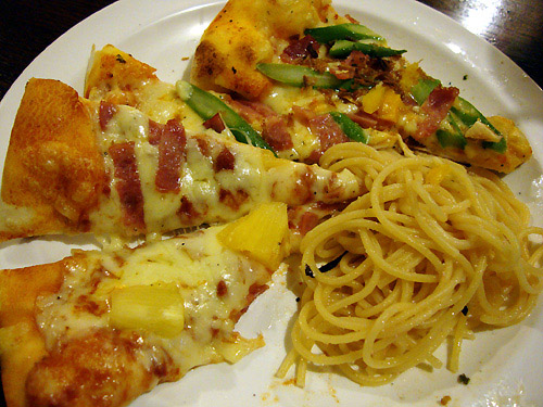 2皿目ー。アスパラのピザうめぇ♪ あと、ちょっと変わり種でチーズとパイナップルのピザもイけます。今度のパスタは和風めんたいで。