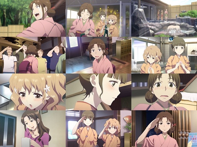 これで本当に仲居人生\(ToT)/オワタ・・・やけくそな巴さんですが、その行動力と思い切りの良さに緒花と菜子は憧れの視線で巴さんに向けるのでした。そして、サバゲーマーたちと巴さんの戦いに巻き込まれ、全身にBB弾と水流を受けた次郎丸は哀れな姿にw 出立時、スイさんと何かを話しているサバゲーマーたち。きっとクレームに違いない・・・謝りながら仲居を辞める事を告げようとする巴さんですが、サバゲーマーたちは逆に巴さんの現場指揮官としての能力を褒め称え、自分たちのミッションに迎合してくれた事を深く感謝するのでした。 また、あのサバゲーマーたちに対して完璧な接客をした(ように見える)巴さんにすっかり憧れた緒花と菜子は、これからは「巴姉さん」と呼ばせてもらうと・・・これですっかり辞める雰囲気を削がれてしまった巴さんは、母親が薦める見合いを断り、再び喜翆荘という戦場に舞い戻るのでした。 つーかやはり田舎だと28歳って行き遅れ組になるんですね・・・。ウチの会社や周囲には30代独身女性なんてわんさといるし、彼女らもそれほど結婚を焦っているようには見えませんけどねぇ。 と、アラフォー独身男が無責任につぶやいてみる。所詮は他人の人生である。