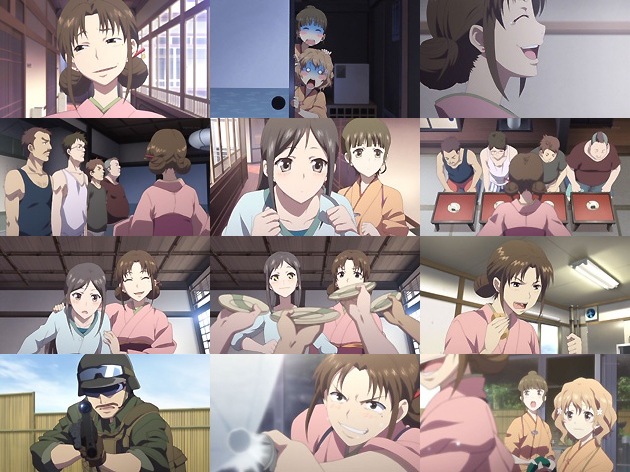 巴さんによって語られる迷惑な客一行の正体、それはサバゲーマーたち。勿論鯖は何も関係ないです民子さん。 老舗旅館をサバゲーの舞台と勘違いしているこの一行は、前回泊まった時にも色々と問題を起こしたようで・・・つーかサバゲーマーなら野営しろよw 風呂掃除の合間にこっそり温泉を堪能する緒花。今回唯一のサービスシーンですが、サバゲーマーたちは裏手からよじ登ってミッション・風呂覗きを敢行・・・って、思いっきり法に抵触してるぢゃんw 寸前に巴さんに発見されて撤退したサバゲーマーたち。友人たちと母親からのプレッシャー、若さを振り撒く同僚たちに迷惑な客・・・不機嫌MAXの巴さんは次郎丸や縁に当たり散らします。男弱いよ、この職場w 仲居としての自分に限界を感じ始めた巴さんは、仕事を辞めて母親の薦める見合いを真剣に受けようと考え始めます。そんな時、たまたま観ていた古い戦争映画で、若い兵士たちを逃がすために最前線に一人で残って捨石になる老兵の姿を見た巴さんは、どうせ辞めるならと、菜子や緒花のためにあのサバゲーマーたちを葬ってから辞めようと決心。 どうでもいいけど、ノーブラタンクトップでビールを飲む姿が何気にエロい巴さんです。