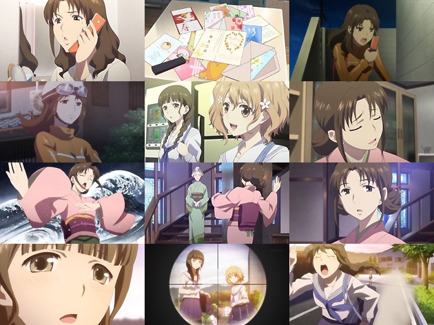 さて、今回は巴さんの話・・・2クールあると脇キャラにもじっくりスポットが当てられるから良いね。 ♪片付いて行く仲間たちにため息〜と、らしくもなく竹内まりやの曲を口ずさんでしまいたくなる巴さん(28歳独身彼氏なし)の近況。母親からも見合い話を薦められ・・・人生の転機を迫られる巴さんは今日もヴェスパでご出勤。旅館仲居の朝は早い。 緒花や菜子の若さにひがみ、演歌に例える自分の生き様をスイさんに生温かく見守られる巴さんの明日はどっちだ。そんなスイさんから、厄介な客の再訪を告げられる巴さん。法を犯すギリギリの行動を取るその客とは一体・・・。 学校帰りの緒花と菜子は、自分たちに向けられる謎の視線に気付きます。その視線の持ち主は胸の大きさの差からターゲットを菜子に定め・・・草むらの中を姿を隠して移動する謎の人影に怯えた菜子は、全力ダッシュで逃げ出します。