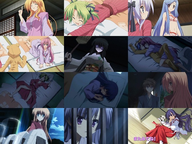 シグナムに大蛇のように巻き付かれるかさね、豪快にパンチラしながら寝るこより・・・寝姿にも個性が出ていて良いですね。そんな中、やはり空腹から目を覚ましてしまった初は、廊下でトイレに起きた一馬と遭遇。つむぎさんが初のために作っておいてくれたおにぎりでようやく空腹を満たした初は、夜の庭で星を見上げながら一馬と仲良く談笑。そんな二人を偶然部屋の窓から見てしまう円佳・・・アバンと言い、恋愛模様は一馬・初・円佳の三角関係に絞られた?個人的には伊吹の株が上がっているので、ぜひ参戦して欲しいところではありますが。