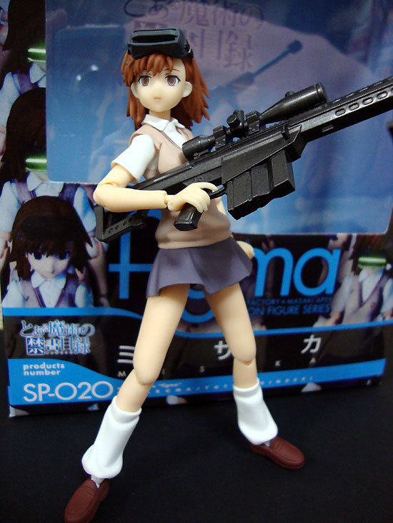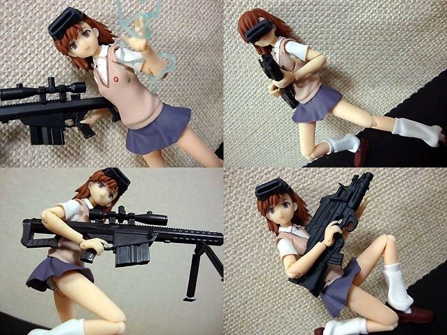ボディはPSPのゲームに付属したfigma美琴と同じ(そりゃそーだ)ですが、こちらはちゃんと縞パン装備♪ ゴーグルは前髪のダボにはめ込む形なので互換性がないのが残念。ただし、武装はいろいろ転用が効きそうです。