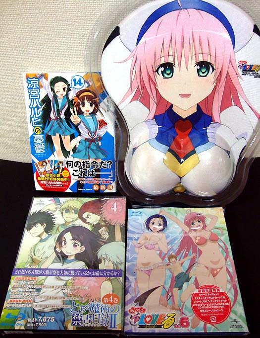 今日は他のアイテムもいろいろ購入。BDは『とある魔術の禁書目録U』の4巻と、『もっとTo LOVEる』6巻(最終巻)、あとコミック版『涼宮ハルヒの憂鬱』14巻です。 『もっとTo LOVEる』はBD全巻購入特典でララのおっぱいマウスパッドが貰えたんですが・・・我が家には美琴さんのちっぱいマウスパッドがあるので、これはK-BOOKSに売却コースかなー。 ハルヒと言えば明日は原作小説最新刊『涼宮ハルヒの驚愕』が発売されるんですよね・・・本当に出るんですよね?(まだ疑ってる)