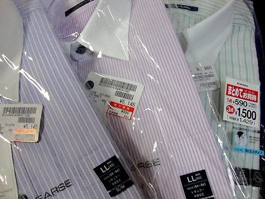 ジャケットが3着で9,800円とかかなりの激安だったんですが、あまり見る時間が無かったのでワイシャツを3つばかり購入〜。定価5,000円クラスの品が590〜990円と格安で買えました♪ この夏の仕事着に新作投入です。