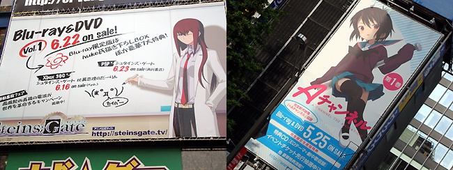 ゲーマーズ上の看板にはシュタゲの助手が登場。第1話で真向かいのラジオ会館8Fで行った講義風景を描くとはなかなかに考えています。 ヤマギワ上にはAチャンネルのトオルが・・・ちっちゃいトオルの大きな看板です。
