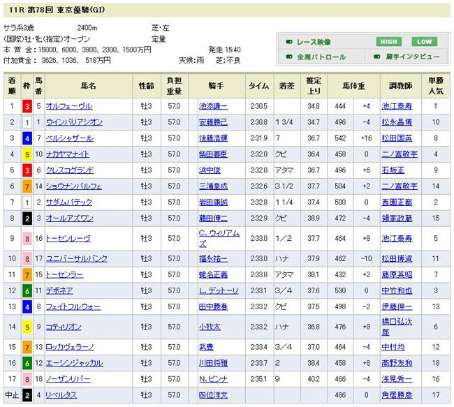 人気は皐月賞を3馬身差で完勝したオルフェーヴルが1番人気。しかし皐月賞は完全にこの馬に流れが向いた事もあって、運が良かっただけという穿った見方をする人もいて単勝は3.0倍と思ったほど人気はしていません。それにこの馬の差し脚質がこの馬場で発揮出来るか・・・死角はありそうです。