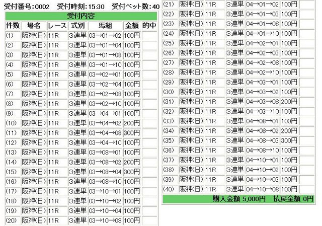 三連単40点買いも、アーネストリーは2・3着付けなのでハズレ。つーか欲張らずに三連複で買ってたら当たってたなぁこれは・・・。