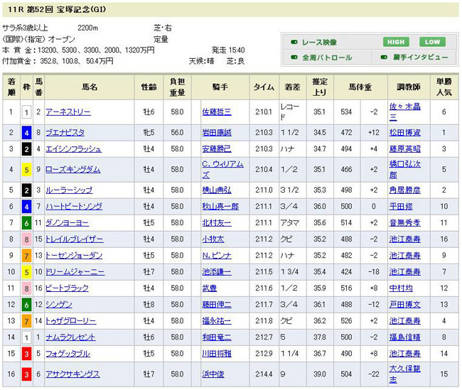 最終コーナーを回ると前の2頭の位置取りは逆になり、アーネストリー先頭で直線へ。大外に出したブエナビスタはじめ、エイシンフラッシュが、ルーラーシップが追い込んで来る中、前を行くアーネストリーが全然止まらない!?まさにタップダンスシチーの再現!後続に影も踏ませない見事な逃走でアーネストリーが同厩舎の偉大な先輩・タップダンスシチーのレコードタイムを1秒も縮める好タイムで春のグランプリ戴冠です。