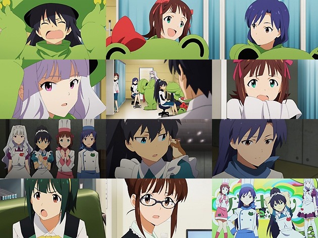 アバンは料理番組の収録風景から。番組の前フリでカエルの被り物をする4人は・・・響と春香、千早に貴音?前者2人はともかく、後者2人はどう考えてもミスキャストだろ?番組の特性を考えたら、やよいやあずさをキャスティングすべきかと。あと、響のプシュがマジパネェですな。