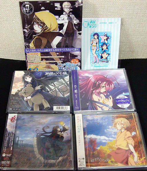 今日の買い物は『とある魔術の禁書目録U』BD7巻(初回限定版)と、『神様のメモ帳』EDと『いつか天魔の黒ウサギ』ED、『ダンタリアンの書架』OP&EDと『花咲くいろは』新EDのCD−Sが4枚。それと、アニメイト夏のAVまつりのポイント特典でアイマスの千早の図書カードをゲットしています。
