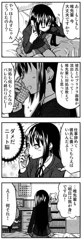 先週半ば、声優界に激震が走ったこのニュース。ポスト平野綾とも言われていた竹達が、平野同様に彼氏との流出写真でスキャンダルとは・・・。 今年の6月に撮られたプリクラと言われていますけど、顔立ちを観ると2年前の6月じゃないですかね。つまり『けいおん!』1期のあずにゃん役を射止めて「すげー美少女声優が現れた!」と騒がれた頃。でぶにゃんになる前(ry ブログのコメ欄を閉じたようですが、こうなったらとりあえずはしばらく大人しくしておくのが吉ですな。今をときめくはなざーさんも同様のスキャンダルでスッパ抜かれましたけど、スルーに成功して今では事件を騒ぐ人もあまりいませんし。
