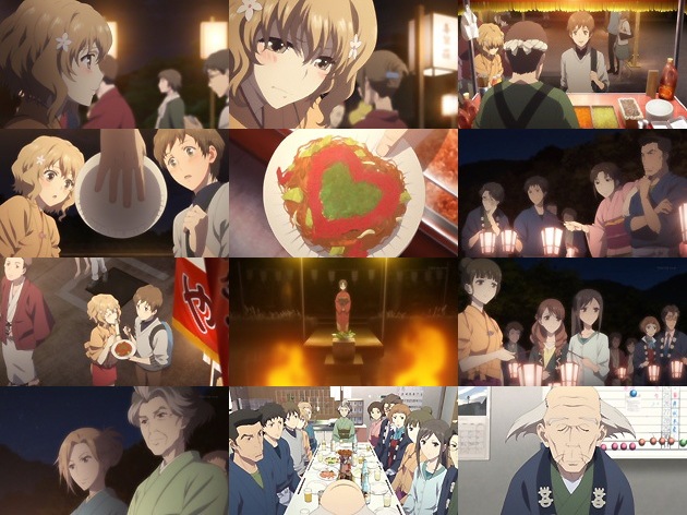 孝ちゃんから湯乃鷺に着いた、とのメールを受け取った緒花は孝ちゃんの元へ走ります。再会出来た二人は屋台を周り、やきそばの屋台の前へ。そこで自分の想いをようやく口にする緒花。 「孝ちゃんが好きです!大好きです!」 ( ゚д゚)ポカーンとする孝ちゃんでしたが、そこにやきそば屋のおっちゃんが粋な計らいをw つーかこんなに紅生姜入れたら、紅生姜の味しかしないじゃん(紅生姜が嫌いなMc.さんです)。 ぼんぼり祭りも佳境に入り、願い札をお焚き上げで天に送るクライマックス・・・本当に良い祭りだなぁ。このアニメを機に実際に開催される事になったという話もある意味凄いですよね。地域の伝統をアニメが作っちゃったわけだし。 祭りが終わった後、喜翆荘に戻って来た面々は豆じいの送別会を開催。その中、エニシングが視聴者の多くが一番気にしていた今後の喜翆荘について方針を述べます!