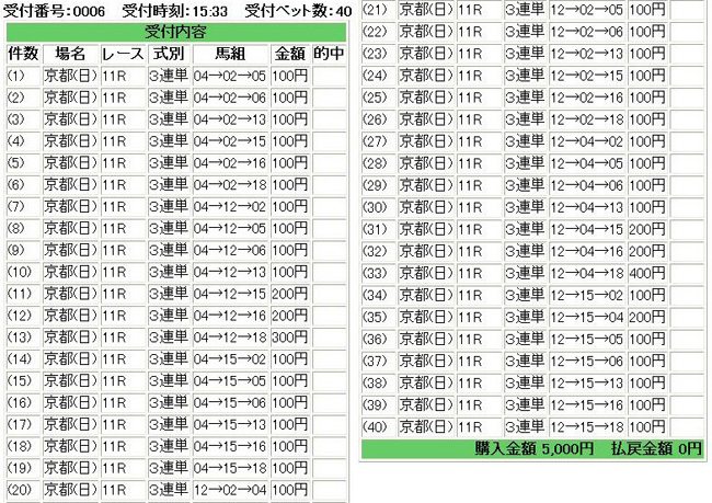 怒涛の40点買いも、1・2着固定のホエールキャプチャが3着で、加えて2着のキョウワジャンヌ抜けでハズレ。