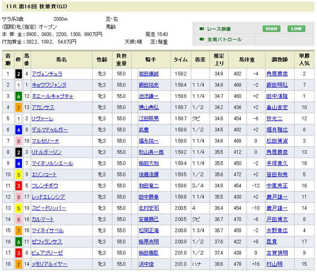 1着は池添の代打騎乗の岩田が仕事をしたアヴェンチュラ。古馬を撃破してきた実力は、春のクラシック組よりも上だったか。