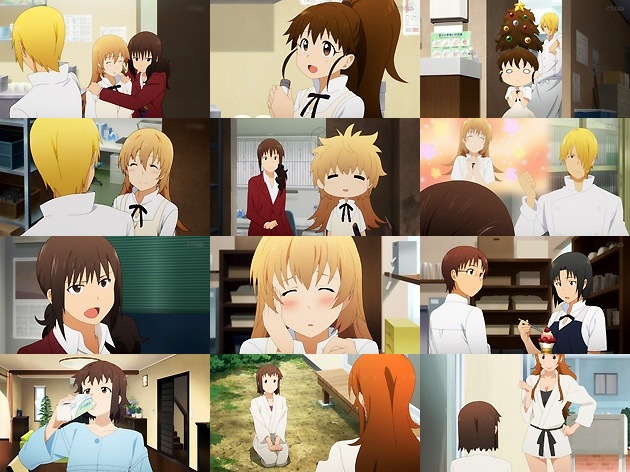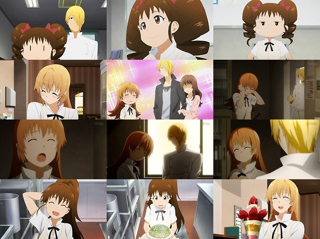 一方、佐藤も調子が上がらず、ぽぷらへの髪型嫌がらせもかえって可愛くまとまってしまい・・・この髪型を見て「マミさん」と言うのはまだケツの青いひよっこ。「瞳子のドリル!」と叫ぶのがやや年季の入ったベテランヲタの正しい姿です!(そうか?) 互いの事が気になって仕事に身が入らない佐藤と八千代・・・そして遂に腹を割って話す時が訪れます!おぉっ!佐藤の告白来るか!! ・・・しかし佐藤はあくまで「好きな人がいる」「告白してダメだったら仕事を辞める覚悟」と抽象的な話ばかりで、結局八千代に想いを伝えられず・・・もうダメダメだぁこの人wwwでもこの遠まわしな優しさが佐藤なんだよなぁ。つーか八千代は、最近のハーレム系アニメの主人公並に好き好きオーラに対して鈍感ですよねw 何はともあれようやくスッキリした両者はいつものペースに。佐藤はぽぷらに意地悪し、八千代は店長にパフェを貢ぐ日々・・・どうやら今期ではまだ誰の恋愛も成就しなさそうですね(^_^;