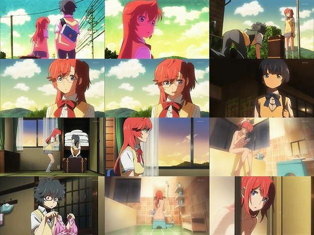 両親を早くに亡くし、肉親は姉しかいない海人(ん?さっきそんな設定見たようなw)はその姉、七海(CV:久川綾)と一緒にこれまた今は亡き祖父母の家で2人暮らし。祖父の遺品である8ミリビデオが趣味のジミメンです。 そんな海人は通学途中、ふとカメラのファインダーを覗いてみると、明らかにそれと分かるJR小海線のキハ110系の窓越しに、赤い髪の少女に気付きます。赤い髪に眼鏡、はちきれんばかりの巨乳・・・どう見てもみずほ先生ですがw しかも自分の赤い髪が人目を引くという事に気付いていない世慣れしてなさから、先日落下した飛行物体に乗って来た宇宙人と推察されます。つーかおねティ好きなら当然そう思うわな。 海人のクラスメイトたち・・・青髪ショートの谷川柑菜(CV:石原夏織・・・ラグりんと言い、今期ブレイクの予感!)がめっちゃタイプです♪あとは天然巨乳ちゃんの北原美桜(CV:阿澄佳奈)と、他1名・・・では可哀想なので、石垣哲郎(CV:荻原秀樹)が仲良しグループのようです。