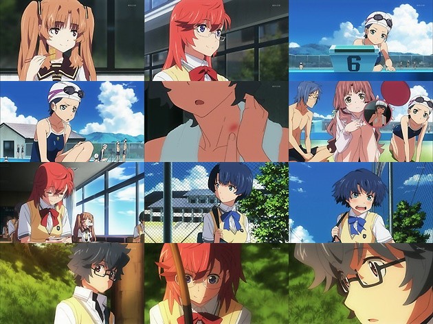 意外にもあっさりふたつ返事で了承するイチカ。面白がった檸檬もこれに参加する事になり、こうして4人の仲間と2人の先輩によるひと夏の物語が動き始めます。 海人に好意を持つ柑菜はそんな海人が面白く無い様子・・・そして、プールの時間(高校なのに男女一緒!?)に海人の首筋にキスマークのような跡を美桜が見付けてちょっとした騒ぎに。どうやらイチカが海人を救った時の跡のようですね。 2年生の教室内の風景・・・鼻ちょうちんの檸檬wwwこういうキャラなのかw そして帰宅時には哲郎が柑菜に映画は海人と近付くチャンスと茶化す形で後押し・・・照れギレする柑菜が可愛いけど、これ実は哲郎が柑菜の事を好きなんじゃ、とも見れますね。『とらドラ!』の長井監督なら、仲間内の恋愛のいざこざなんてお手の物でしょうし! 家路の途中に魚のいない川に竿を下ろすイチカを見付けた海人。今夜の宿がないというイチカに海人は・・・