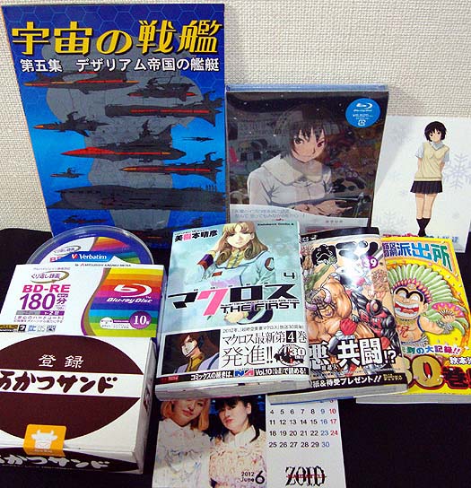 BDは『アマガミSS+』第3巻(七咲逢編)。コミックは『マクロス THE FIRST』4巻、『キン肉マン』39巻、『こち亀』180巻。同人誌は『宇宙戦艦ヤマト』のメカ本、それにBD-REのメディアに万かつサンド、そしてZOIDの6月カレンダー。