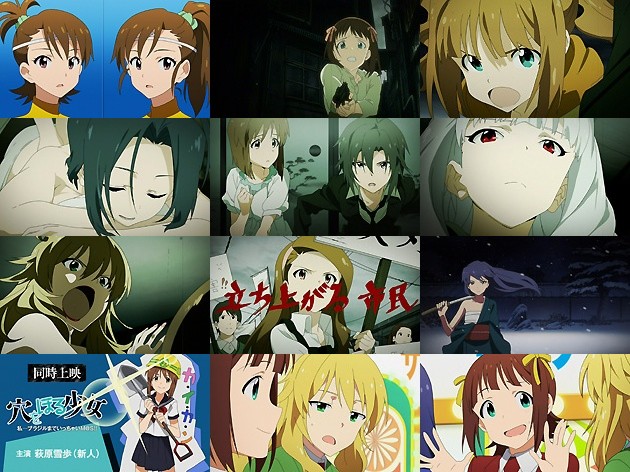 亜美真美ちゃんコーナーに続いては、765PROオールスターズが出演した極道映画の告知。鉄砲玉の春香の小者っぷりや次々と殺されるメンバーたちにも注目ですが、ここはやはりあずささんの半裸マッサージシーンでしょうかw そして若頭:真(似合い過ぎw)のアクションや情婦:美希の「泥棒猫!」、プロ市民の伊織などを描写し、最後は貴音と千早の組長対決・・・千早さん、サラシ姿がお似合いで。巻きやすそうだし(コラ 同時上映は雪歩主演の『穴をほる少女』。カ・イ・カ・ン・・・って、時かけのパロディかと思ったらセーラー服と機関銃の方かw で、劇中の自分の役に不満の美希は春香にジト目・・・えー、いいじゃんねぇ情婦の美希。中学生にやらせる役じゃないけど!