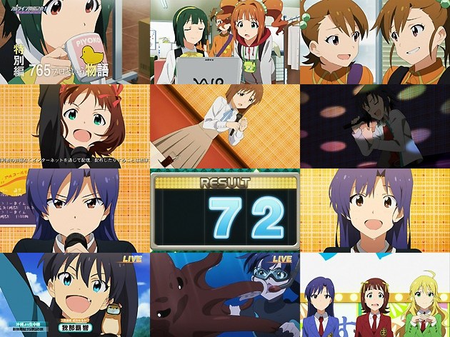 今回は765PROの日常をオムニバス形式で送る特別編。あの懐かしい面々が再び画面の中で動くというだけで全国のPは狂喜雀躍、龍躍鳳鳴ですよ。 カラオケにやって来た春香・千早・真・雪歩。点数採点付きのマシンで高得点を叩きだす春香たち・・・さすがはプロです。しかし765PROでも歌唱力★★★★★の千早だけ、なぜか60点台と絶不調。意地になった千早はマイクを握り続け、72点(やっぱり出たかこの数字w)、73点と少しずつ点を重ねて行き、遂に100点満点を弾き出す事に成功!・・・しかしその間ずっと待たされた春香たちはぐんにょりw いかにもなエピソードです。 その後は第15話を彷彿とさせる『生っすか!?サンデー』のスタジオから。故郷沖縄からの生中継に燃える響はダイビングに挑戦。タコと格闘する見せ場を作りますが、直後にカメラの前を巨大なサメが通り過ぎ・・・その後しっかり飼い慣らす映像が流れますが、多分アレはヤヴァい類のサメだと思うw