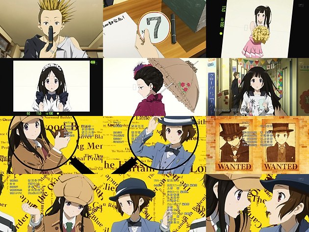 さて!ここで新EDがお披露目です。これまでのしっとりとした百合テイストの落ち着いた物から180度方向性を変え、えるがホームズ、摩耶花がポアロに、奉太郎がルパン、里志がモリアーティに扮した楽しいコメディタッチの物となりました。つーかえる&摩耶花の探偵コンビが超絶可愛えぇ♪これが京アニの本気か・・・