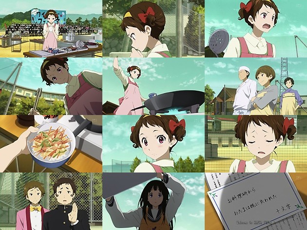 実況はお料理研の副部長、そして解説は見るからに怪しげなお料理研の部長@杉田智和wwwうはwww悪い予感しかしねぇ!! 先鋒の里志はまず豚汁作りからスタート。大根の皮をピーラーで剥いたりとやや独創的な手法を用いるものの、自分から買って出ただけはあって高校生男子としてはなかなかの料理の腕前のようです。 しかし出汁の煮干しの頭と腹わたを取るなどこまめな下処理をし過ぎた結果、1品しか作る事が出来ずに中堅のえるにバトンタッチ。何となく料理下手そうなえるでしたが、いきなり大根の桂剥きを披露するなど思わぬ才能を発揮!・・・まぁ豪農千反田家の娘だもんな、料理が得意な環境にあっても不思議は無いか。 全チーム中、一番ヤバい物を作っているのがチーム天文部・・・沢木口先輩は火を使わせてはいけないタイプのようでwwwつーかこの辺から解説の杉田が五月蝿いw絶対アドリブだろ! 手際良く数々のお惣菜を作り上げるえるですが・・・調子に乗って作り過ぎた挙句、食材を大将=摩耶花の分まで使い果たしてしまい大ピンチ!1人が1品以上作るルールから、摩耶花が何も作らないとチーム古典部は失格になってしまいます・・・。